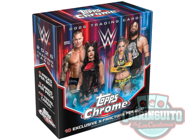 Topps Chrome WWE 2026 Mega Box con 1 paralela numerada, 6 inserts y 10 X-Refractor. 6 packs, 48 cartas.