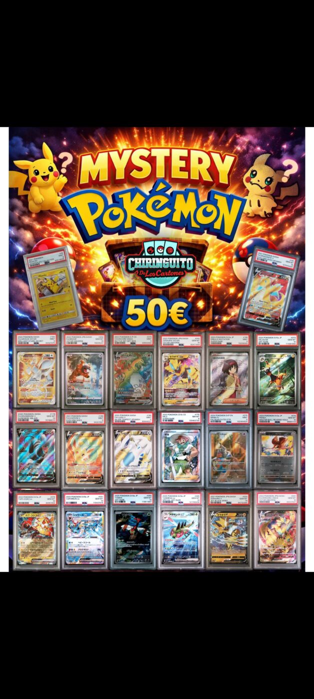 Descubre la emoción del Mystery Pack Pokémon de El Chiringuito de los Cartones. Cada pack numerado incluye 3 sobres Pokémon que pueden ser en Español, Inglés o Japonés, cartas sueltas de diferentes rarezas y la posibilidad de obtener premios especiales como Funko, cartas PSA o sobres originales Base Set 1999 (Charizard, Blastoise o Venusaur Artwork).