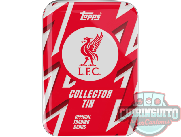 Lata oficial del Liverpool FC con 35 cartas, 2 paralelas numeradas garantizadas y posibilidad de cartas autografiadas en latas seleccionadas.