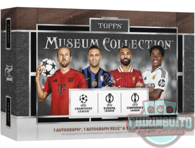 Topps Museum Collection UEFA Club Competitions 2024/25 es una colección premium que garantiza 1 autógrafo, 1 relic, 1 autógrafo relic y 1 paralela base por caja, con estrellas y jóvenes talentos del fútbol europeo.